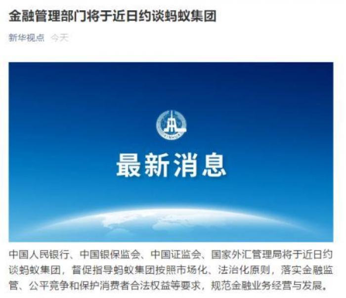 据新华视点消息,中国人民银行、中国银保监会、中国证监会、国家外汇管理局将于近日约谈蚂蚁集团,督促指导蚂蚁集团按照市场化、法治化原则,落实金融监管、公平竞争和保护消费者合法权益等要求,规范金融业务经营与发展。