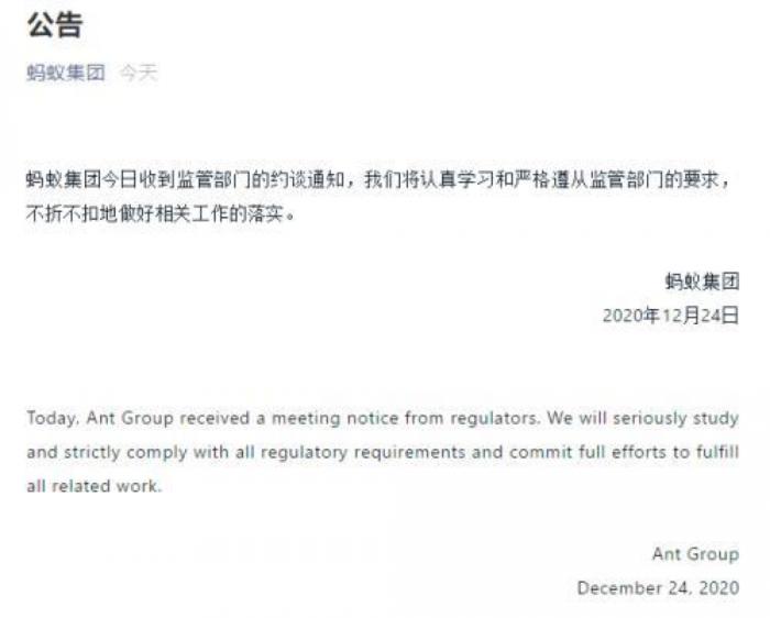 随后,蚂蚁集团回应称,今日收到监管部门的约谈通知,我们将认真学习和严格遵从监管部门的要求,不折不扣地做好相关工作的落实。