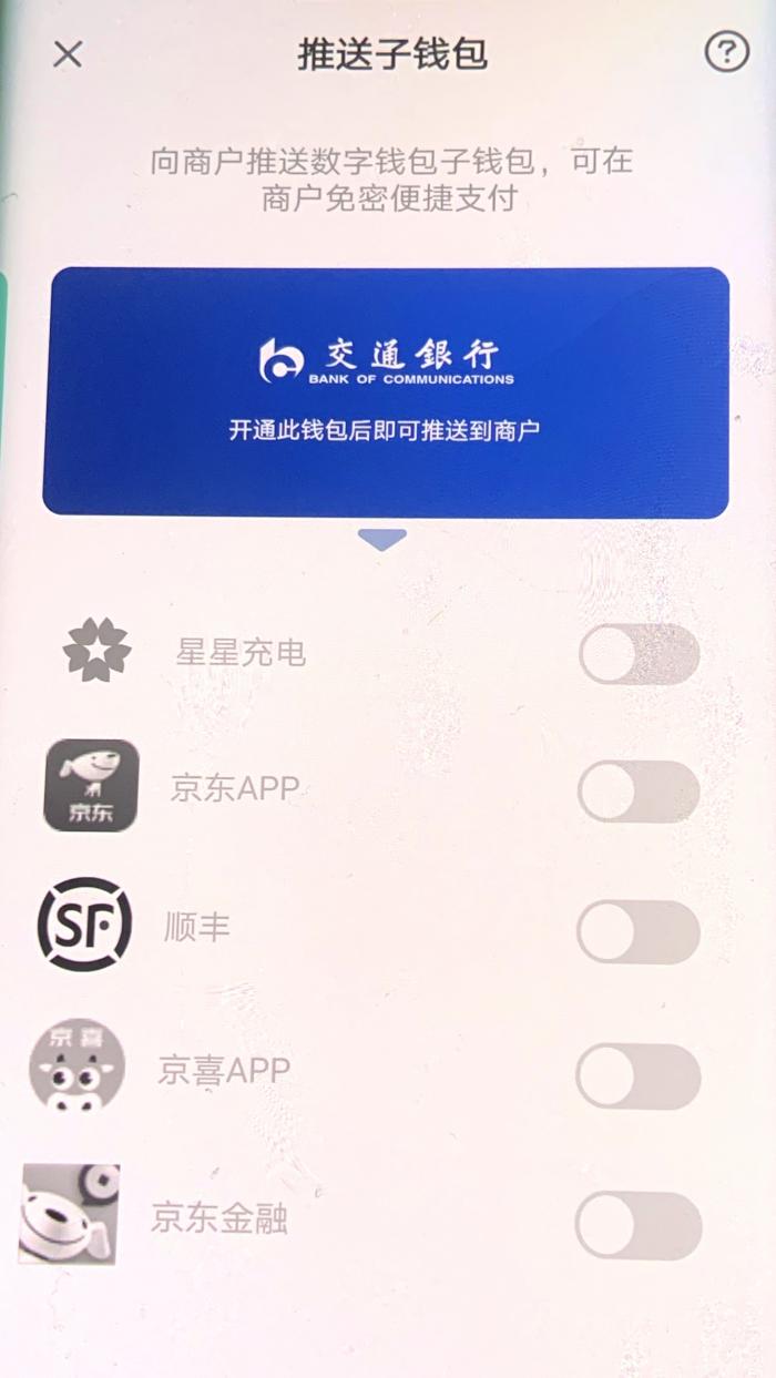在数字人民币APP中,左右滑屏可以看到六大国有行(工农中建交储)的界面,不同银行下会呈现对应的合作商户,即子钱包。如,六大行都支持京东APP、京喜APP、京东金融;此外,工商银行还对接了美团骑车、滴滴出行;中国银行还对接了哔哩哔哩;建设银行还对接了善融商务;邮储银行对接了石化金融;交通银行对接了星星充电、顺丰。