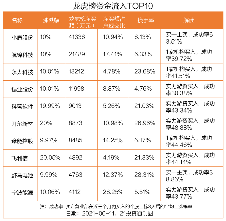 6月11日,上证指数下跌0.58%,深证成指下跌0.62%,创业板指上涨0.4%。盘后龙虎榜数据显示,共有43只个股因当日异动登上龙虎榜,资金净流入最多的是小康股份(601127.SH),达4.13亿元。