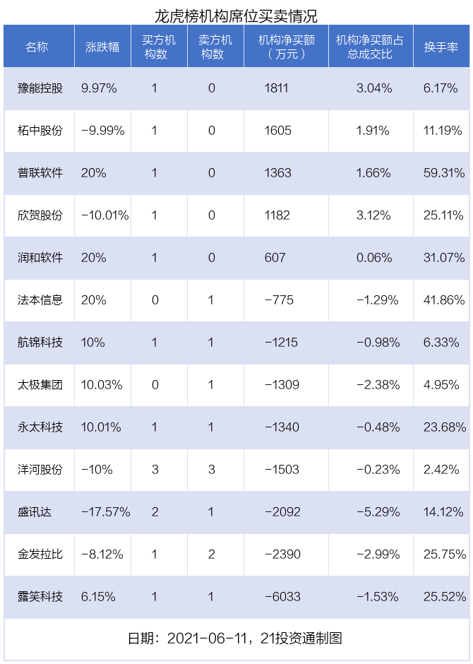 6月11日,13只个股龙虎榜出现了机构的身影,机构合计净卖出1.01亿元。具体来看,机构净买入5股,净卖出8股。