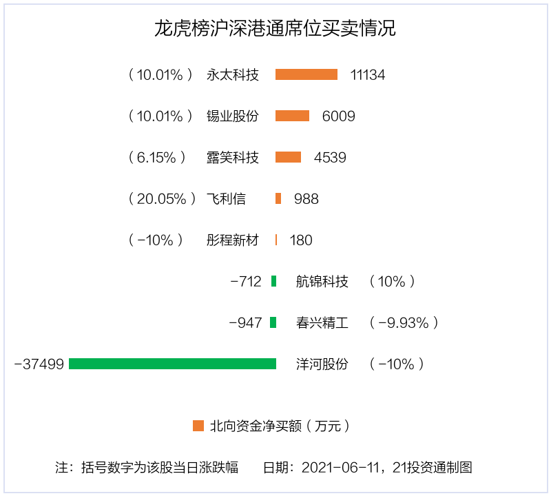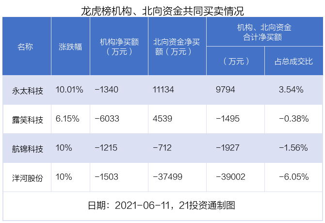 值得注意的是,机构和北向资金共同净卖出了航锦科技、洋河股份等2股;在永太科技,露笑科技上出现分歧,机构净卖出永太科技1339.63万元,北向资金净买入1.11亿元;机构净卖出露笑科技6033.48万元,北向资金净买入4538.72万元。