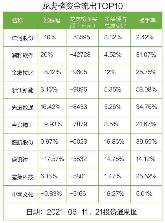 而龙虎榜中资金净流出最多的是洋河股份(002304.SZ),被净卖出为5.36亿元,占总成交金额的8.32%。洋河股份收盘下跌10%,换手率为2.42%。