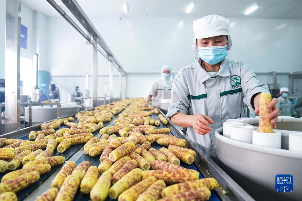 工人在吉林省农嫂食品有限公司生产车间内加工鲜食玉米(6月6日摄)。新华社记者许畅摄