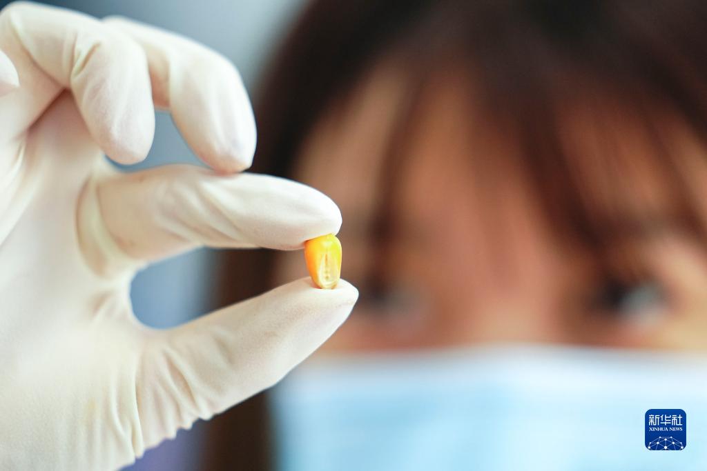 在吉林省宏泽现代农业有限公司实验室内,科研人员展示培育的玉米种子(6月7日摄)。新华社记者许畅摄