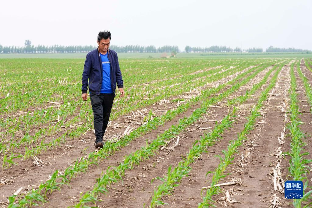 吉林省公主岭市朝阳坡镇东兴村种粮大户李振军行走在田野间观察玉米长势(6月6日摄)。新华社记者许畅摄