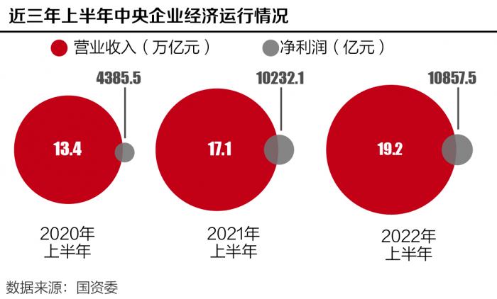 “上半年,中央企业经济运行好于预期。”7月22日,国务院国有资产监督管理委员会秘书长、新闻发言人彭华岗在国新办新闻发布会上介绍2022年上半年中央企业经济运行情况。据其介绍,1—6月,中央企业实现营业收入19.2万亿元,同比增长12%,实现利润总额1.4万亿元,同比增长7.1%。实现净利润1.1万亿元,同比增长6.1%。累计上交税费1.5万亿元,同比增长14.4%。累计完成固定资产投资1.2万亿元,同比增长6.7%。