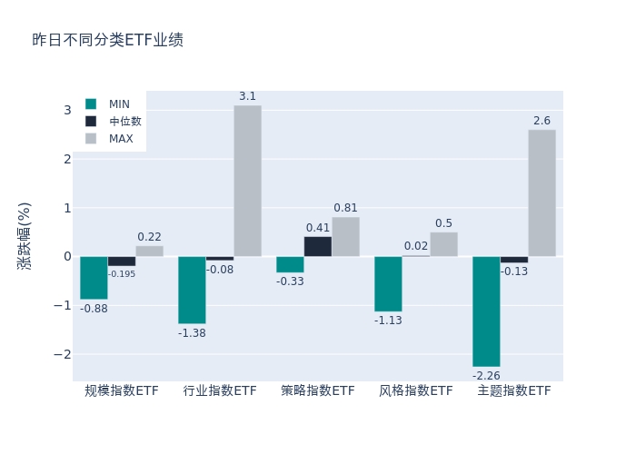 11月9日,股票型ETF收益率中位数为-0.11%。其中按照不同分类,规模指数中易方达上证中盘ETF收益率最高,为0.22%;行业指数中国泰中证煤炭ETF收益率最高,为3.1%;策略指数中华泰柏瑞上证红利ETF收益率最高,为0.81%;风格指数中富国中证价值ETF收益率最高,为0.5%;主题指数中广发中证光伏龙头30ETF收益率最高,为2.6%。