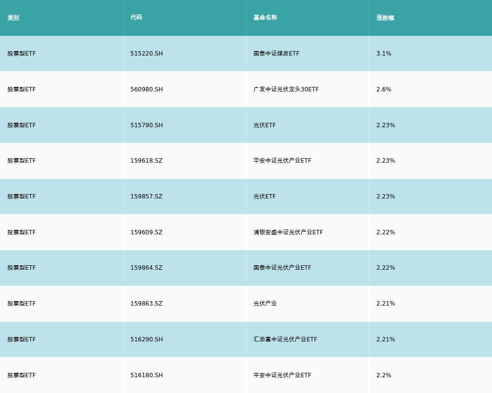 11月9日,股票型ETF涨幅最高的3支ETF及其收益率分别为:国泰中证煤炭ETF(3.1%)、广发中证光伏龙头30ETF(2.6%)、光伏ETF(2.23%)。涨幅前10详情见下表: