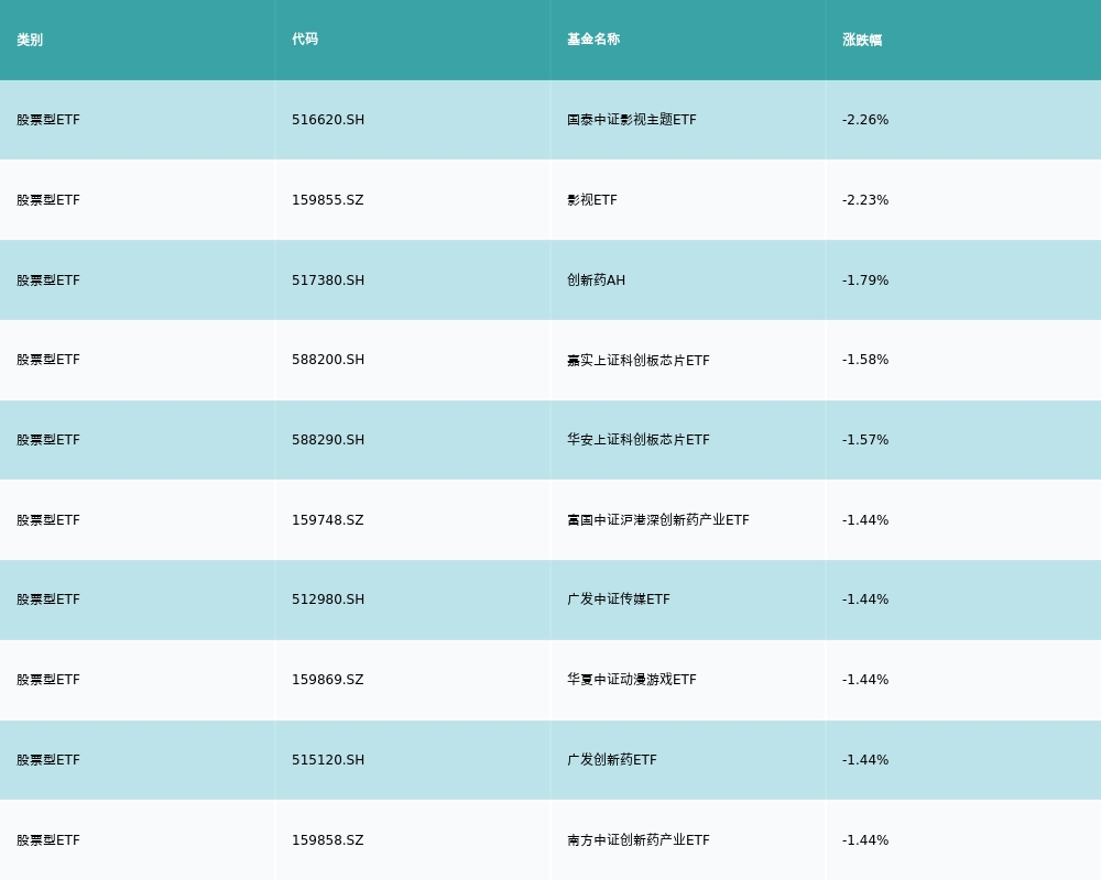 11月9日,股票型ETF跌幅最大的3支ETF及其收益率分别为:国泰中证影视主题ETF(-2.26%)、影视ETF(-2.23%)、创新药AH(-1.79%)。跌幅前10详情见下表: