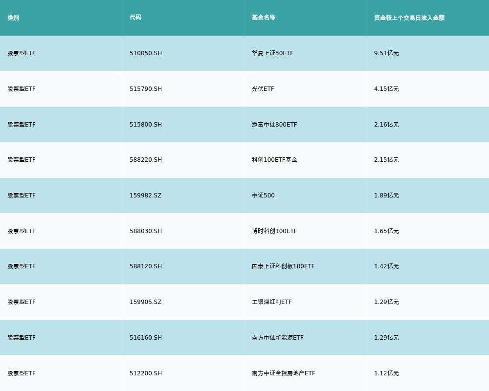 11月9日,股票型ETF资金流入最多的3支ETF及其流入金额分别为:华夏上证50ETF(流入9.51亿元)、光伏ETF(流入4.15亿元)、添富中证800ETF(流入2.16亿元)。资金流入前10详情见下表: