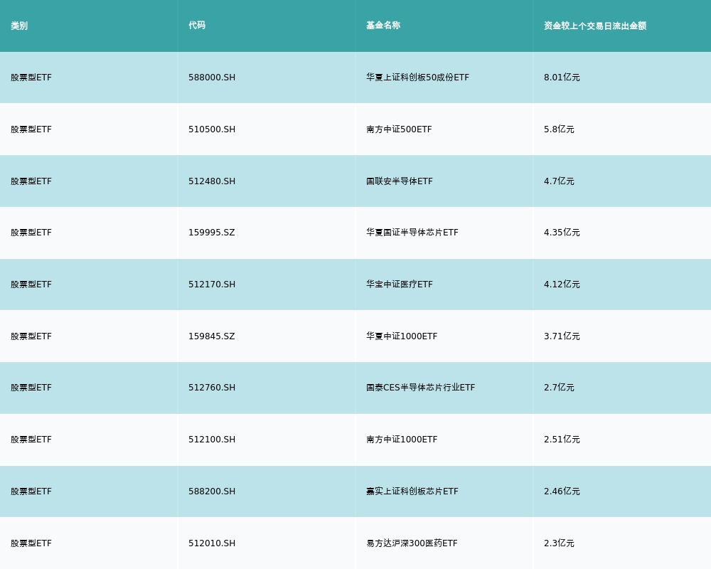 11月9日,股票型ETF资金流出最多的3支ETF及其流入金额分别为:华夏上证科创板50成份ETF(流出8.01亿元)、南方中证500ETF(流出5.8亿元)、国联安半导体ETF(流出4.7亿元)。资金流出前10详情见下表: