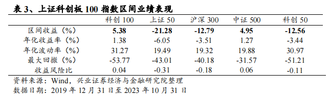 而从业绩表现来看,自基日以来,科创100指数累计收益超越了上证50、沪深300、中证500等主流宽基指数:截至2023年10月31日,科创100指数区间收益率为5.38%,同期上证50、沪深300及中证500的收益率分别为-21.28%、-12.79%以及4.95%。