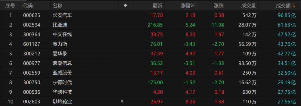 个股方面,长安汽车成交额居首,为96.85亿元,其次是比亚迪、中文在线、赛力斯、易华录,成交额分别为61.63亿元、47.52亿元、43.70亿元、42.77亿元。