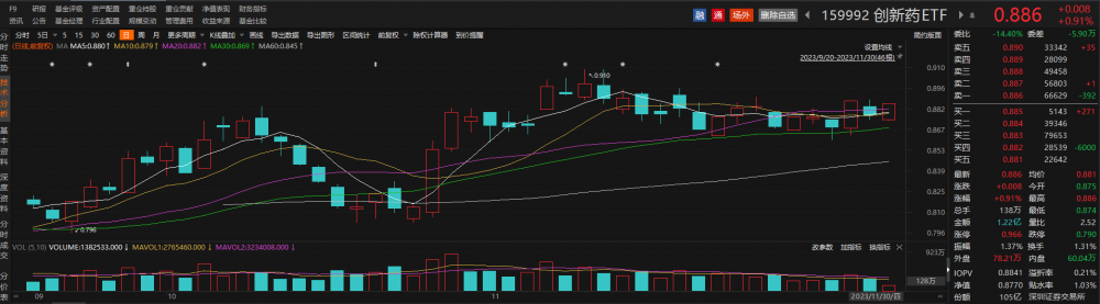 跟踪中证创新药产业指数的ETF中规模最大的创新药ETF(159992)震荡走强,盘中交投活跃。截至发稿,该ETF上涨0.91%,溢折率为0.21%,成交金额达1.22亿元。