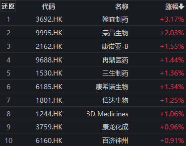 港股方面,医疗医药股涨跌互现。相关指数中,中证港股通医药卫生综合指数 (930965) 下跌。截至发稿,上涨成分股中,翰森制药涨超3%,荣昌生物涨逾2%,康诺亚-B、再鼎医药、三生制药、康希诺生物、信达生物、3D Medicines、康龙化成、百济神州等跟涨。
