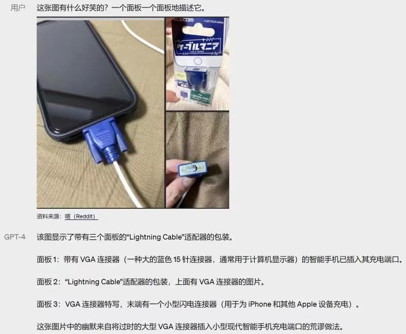 OpenAI用一张“梗图”演示了GPT-4特有的多模态功能。用户提问:解释下图的笑点是什么,并对图片中的每部分进行描述。GPT-4的回答如下图所示: