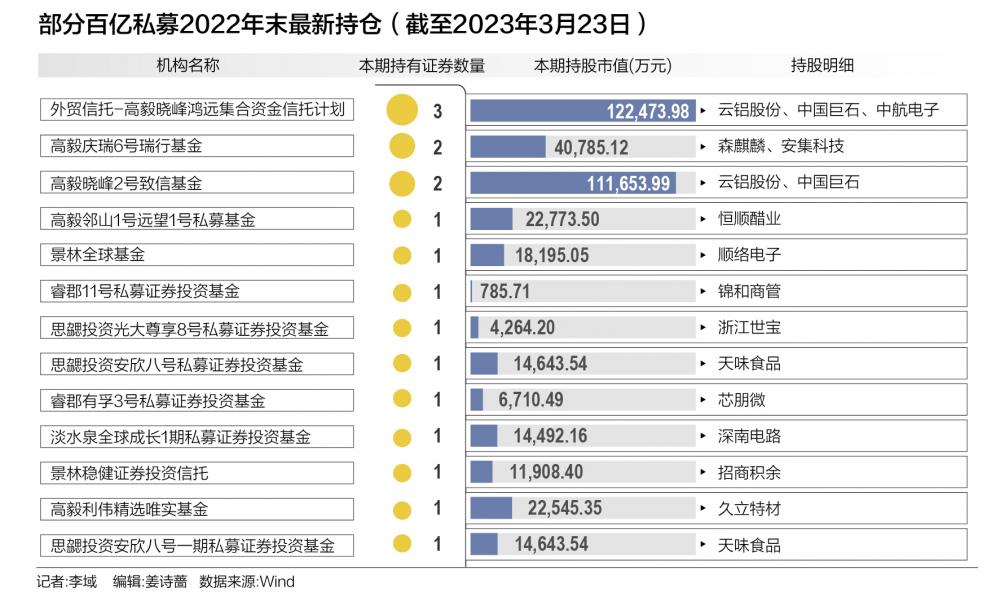 4、21世纪经济报道:随着上市公司陆续披露2022年报,高毅、景林、淡水泉、重阳、思勰等多家百亿私募的最新持仓也浮出水面。整体来看,部分百亿私募加仓了恒顺醋业、天味食品等行业龙头股,也有部分私募新进入云铝股份、顺络电子等前十大流通股东。