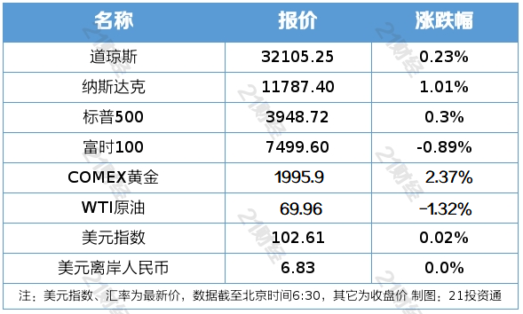 2、美国三大股指全线收涨,道指涨0.23%报32105.25点,标普500指数涨0.3%报3948.72点,纳指涨1.01%报11787.4点。中概股普遍上涨,世纪互联涨16.44%,达达集团涨16.11%。