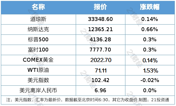 1、美股三大股指全线收涨,道指涨0.14%报33348.6点,标普500指数涨0.3%报4136.28点,纳指涨0.66%报12365.21点。英特尔涨2.94%,美国运通涨1.4%,领涨道指。中概股普遍上涨,图森未来涨28.03%,比特数字涨10.61%。
