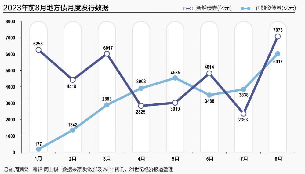 21世纪经济报道记者梳理发现,8月地方债发行规模达1.3万亿元,其中新增债券超7000亿元,再融资债券超6000亿元,均为今年以来月度发行峰值。