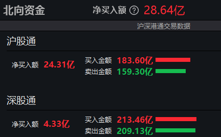 北向资金半日净买入28.64亿元。其中沪股通净买入24.31亿元,深股通净买入4.33亿元。