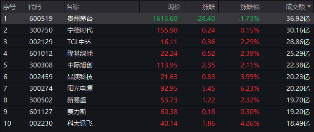 沪深两市半日成交额4428亿,较上个交易日同期放量267亿。个股方面,贵州茅台、宁德时代均超30亿元,分别为36.92亿元、30.16亿元;TCL中环、隆基绿能、中际旭创、晶澳科技、阳光电源成交额均超20亿元。