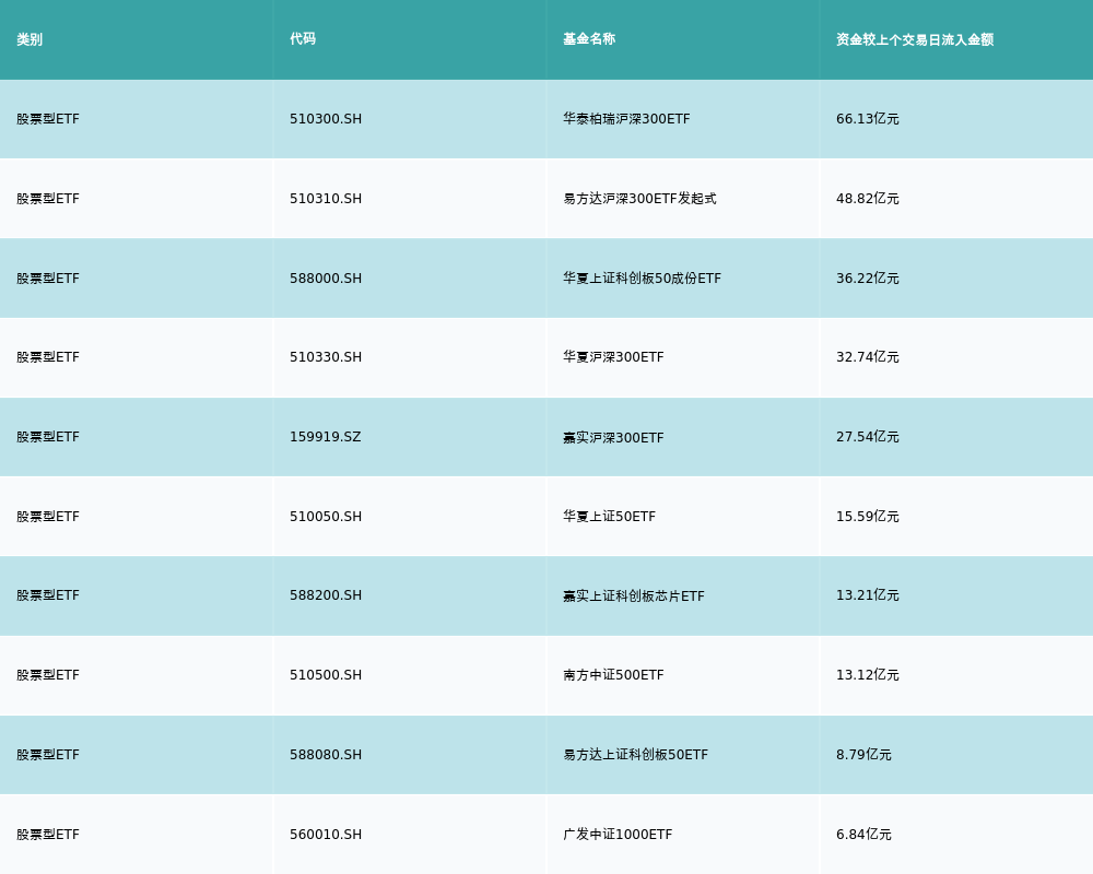 昨日股票型ETF资金流入最多的3支ETF及其流入金额分别为:华泰柏瑞沪深300ETF(流入66.13亿元)、易方达沪深300ETF发起式(流入48.82亿元)、华夏上证科创板50成份ETF(流入36.22亿元)。资金流入前10详情见下表: