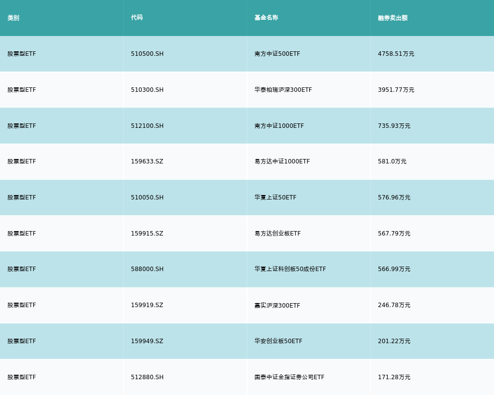 昨日股票型ETF融资卖出额最高的3支ETF及其卖出金额分别为:南方中证500ETF(4758.51万元)、华泰柏瑞沪深300ETF(3951.77万元)、南方中证1000ETF(735.93万元)。融券卖出额前10详情见下表: