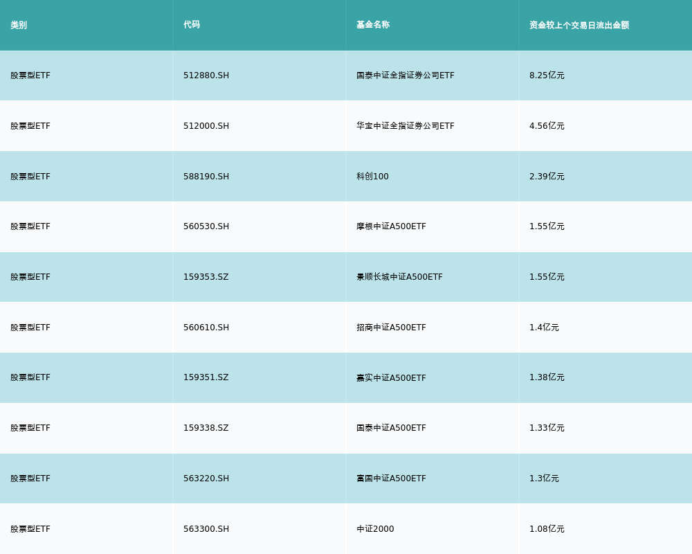 昨日股票型ETF资金流出最多的3支ETF及其流出金额分别为:国泰中证全指证券公司ETF(流出8.25亿元)、华宝中证全指证券公司ETF(流出4.56亿元)、科创100(流出2.39亿元)。资金流出前10详情见下表: