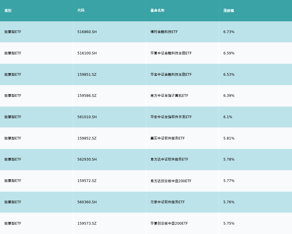 昨日股票型ETF涨幅最高的3支ETF及其收益率分别为:博时金融科技ETF(6.73%)、华夏中证金融科技主题ETF(6.59%)、华宝中证金融科技主题ETF(6.53%)。涨幅前10详情见下表: