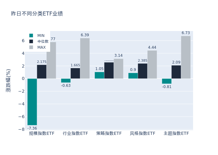 昨日股票型ETF收益率中位数为2.15%。其中按照不同分类,规模指数中易方达创业板中盘200ETF收益率最高,为5.77%;行业指数中南方中证全指计算机ETF收益率最高,为6.39%;策略指数中红利TK收益率最高,为3.14%;风格指数中国寿安保创精选88ETF收益率最高,为4.44%;主题指数中博时金融科技ETF收益率最高,为6.73%。