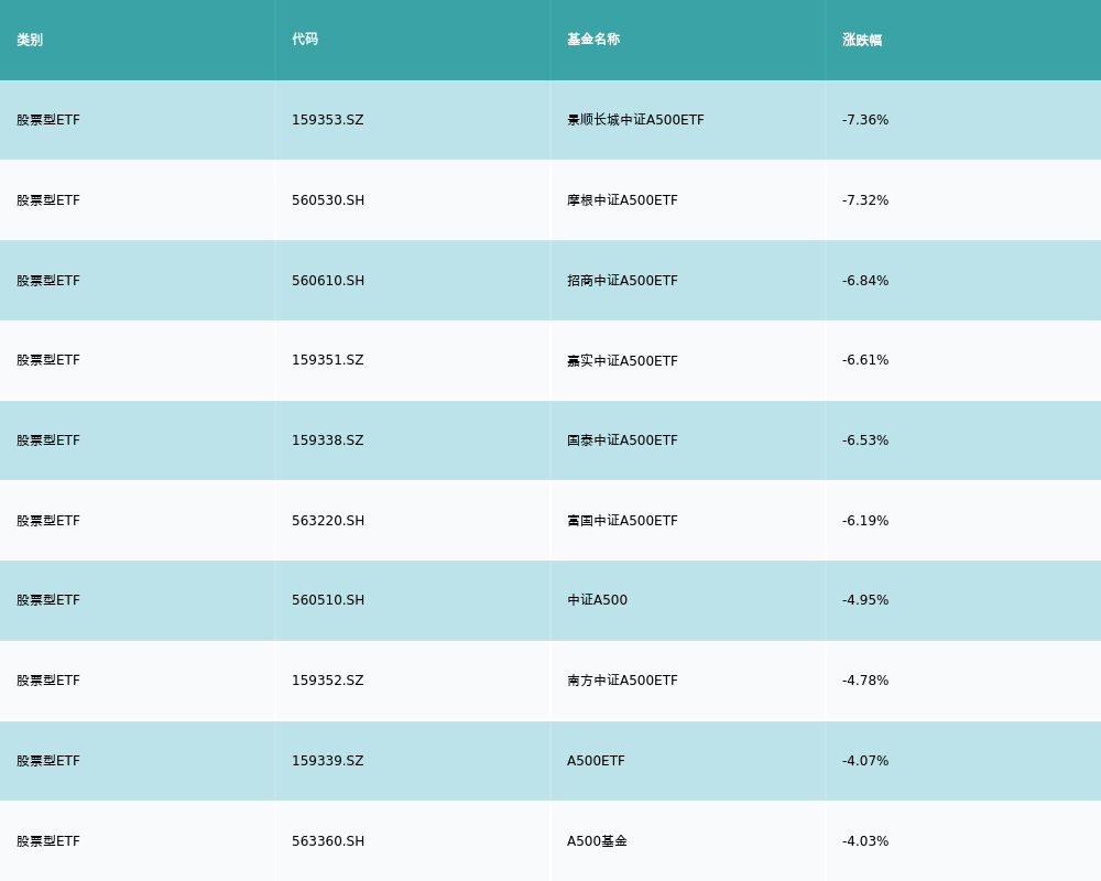 昨日股票型ETF跌幅最大的3支ETF及其收益率分别为:景顺长城中证A500ETF(-7.36%)、摩根中证A500ETF(-7.32%)、招商中证A500ETF(-6.84%)。跌幅前10详情见下表: