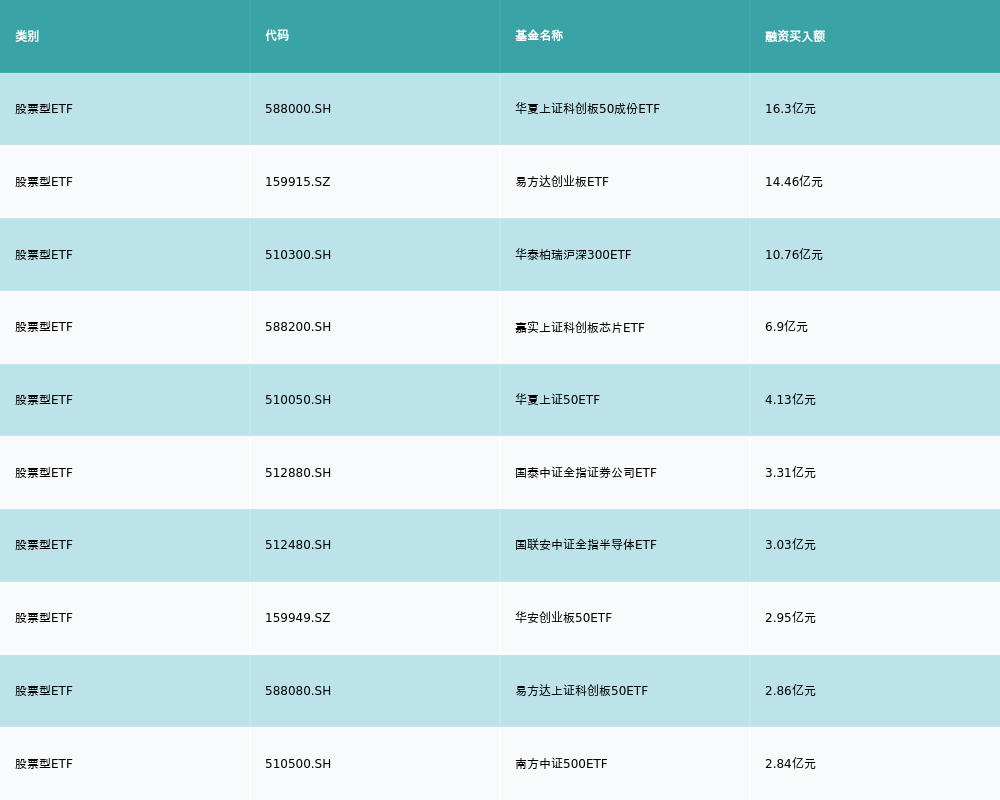 昨日股票型ETF融资买入额最高的3支ETF及其买入金额分别为:华夏上证科创板50成份ETF(16.3亿元)、易方达创业板ETF(14.46亿元)、华泰柏瑞沪深300ETF(10.76亿元)。融资买入额前10详情见下表: