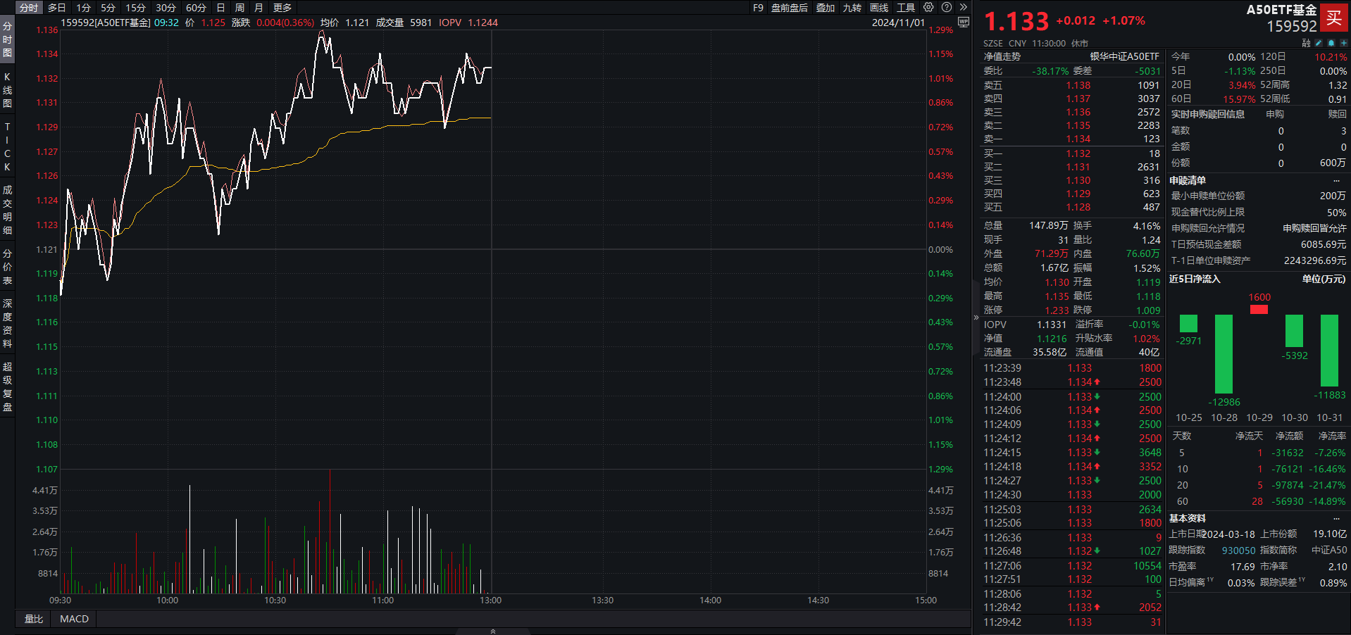 相关ETF方面,A50ETF基金(159592)截至午间收盘涨1.07 %,成交额超1.6亿元,换手率超4%,盘中成交活跃。