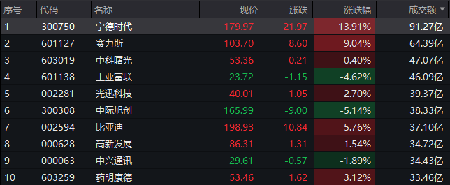沪深两市半日成交额6050亿,较上个交易日同期放量975亿。个股方面,宁德时代成交额91.27亿元居首,赛力斯超60亿元,中科曙光、工业富联成交额均超40亿元。