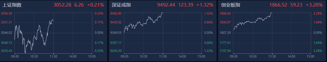 市场早盘震荡走高,创业板指领涨。南财金融终端显示,截至早盘收盘,沪指涨0.21%,深成指涨1.32%,创业板指涨3.28%。总体上个股涨多跌少,全市场超3600只个股上涨。