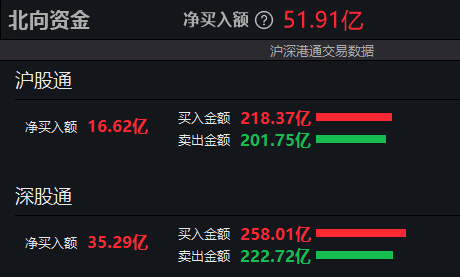 北向资金半日净买入51.91亿元。其中沪股通净买入16.62亿元,深股通净买入35.29亿元。