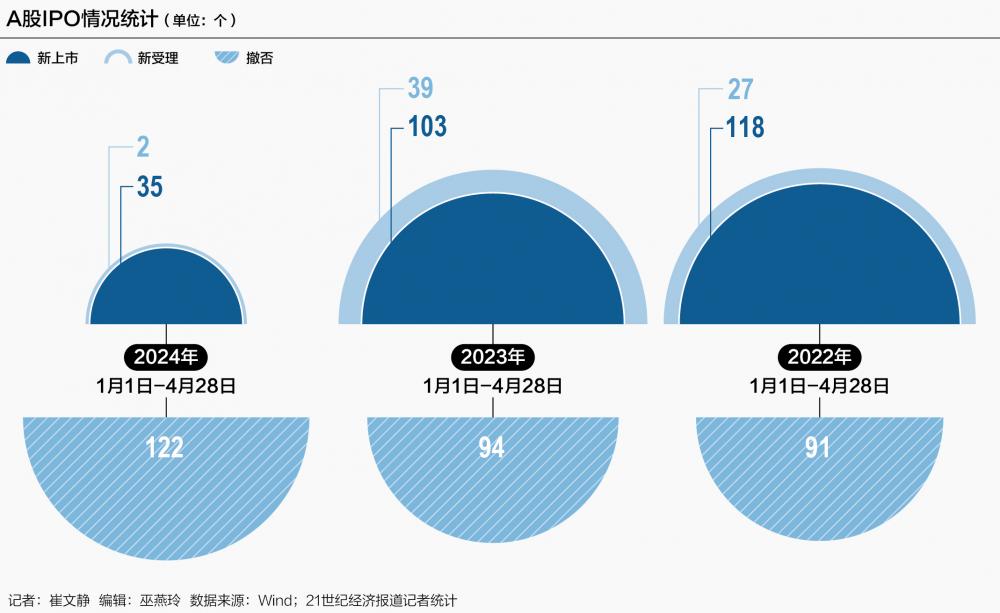 根据Wind,截至4月28日(下同)年内新上市企业仅有35家,而2021年—2023年同期则分别有159家、118家和103家,今年新股IPO数量仅相当于过去三年的22.01%、29.66%和33.98%。
