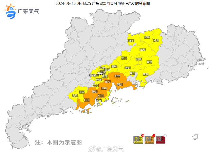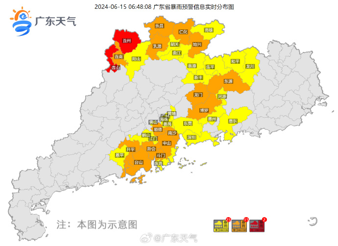 6月15日6时,中央气象台继续发布暴雨黄色预警,预计6月15日08时至16日08时,广东中北部和西南部沿海等地部分地区有大到暴雨,部分地区伴有短时强降水(最大小时降雨量30~50毫米,局地可超过70毫米),局地有雷暴大风等强对流天气。