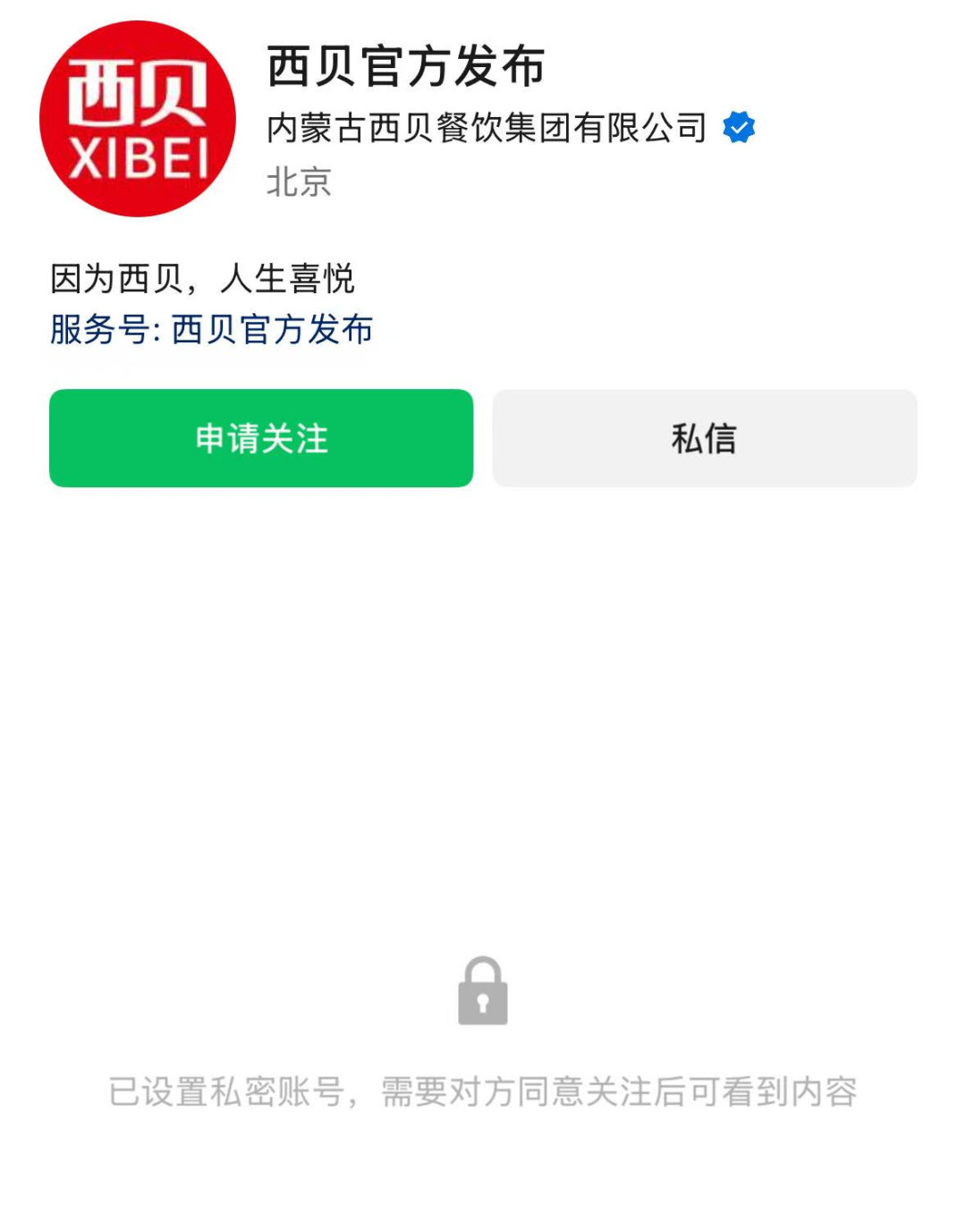 西贝的微信官方发布账号也还处于私密状态。