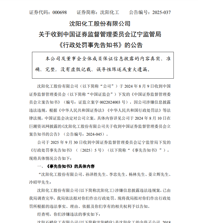沈阳化工及相关责任人目前已收到辽宁证监局下发的《事先告知书》。辽宁证监局拟决定对沈阳化工给予警告,并处以700万元的罚款;对孙泽胜、李忠、杨林、姜立辉、冷昭甲分别给予警告,分别处以350万元、300万元、120万元、120万元和100万元的罚款。