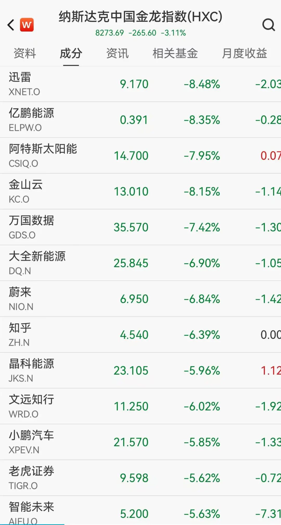 中概股方面,纳斯达克中国金龙指数跌超3%,多只热门中概股走低。