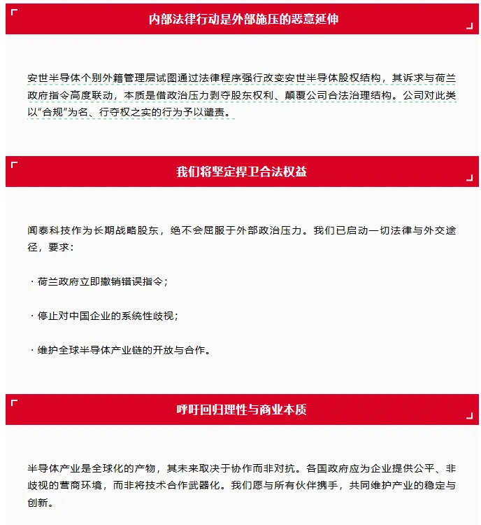 安世半导体个别外籍管理层试图通过法律程序强行改变安世半导体股权结构,其诉求与荷兰政府指令高度联动,本质是借政治压力剥夺股东权利、颠覆公司合法治理结构。公司对此类以“合规”为名、行夺权之实的行为予以谴责,并将坚定捍卫合法权益。