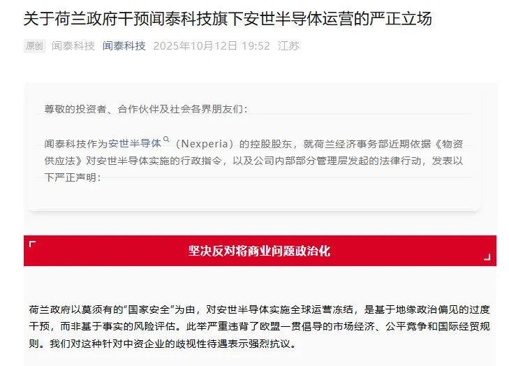 10月12日晚间,闻泰科技发表声明称,坚决反对将商业问题政治化。荷兰政府以莫须有的“国家安全”为由,对安世半导体实施全球运营冻结,是基于地缘政治偏见的过度干预,而非基于事实的风险评估,这种针对中资企业的歧视性待遇表示强烈抗议。
