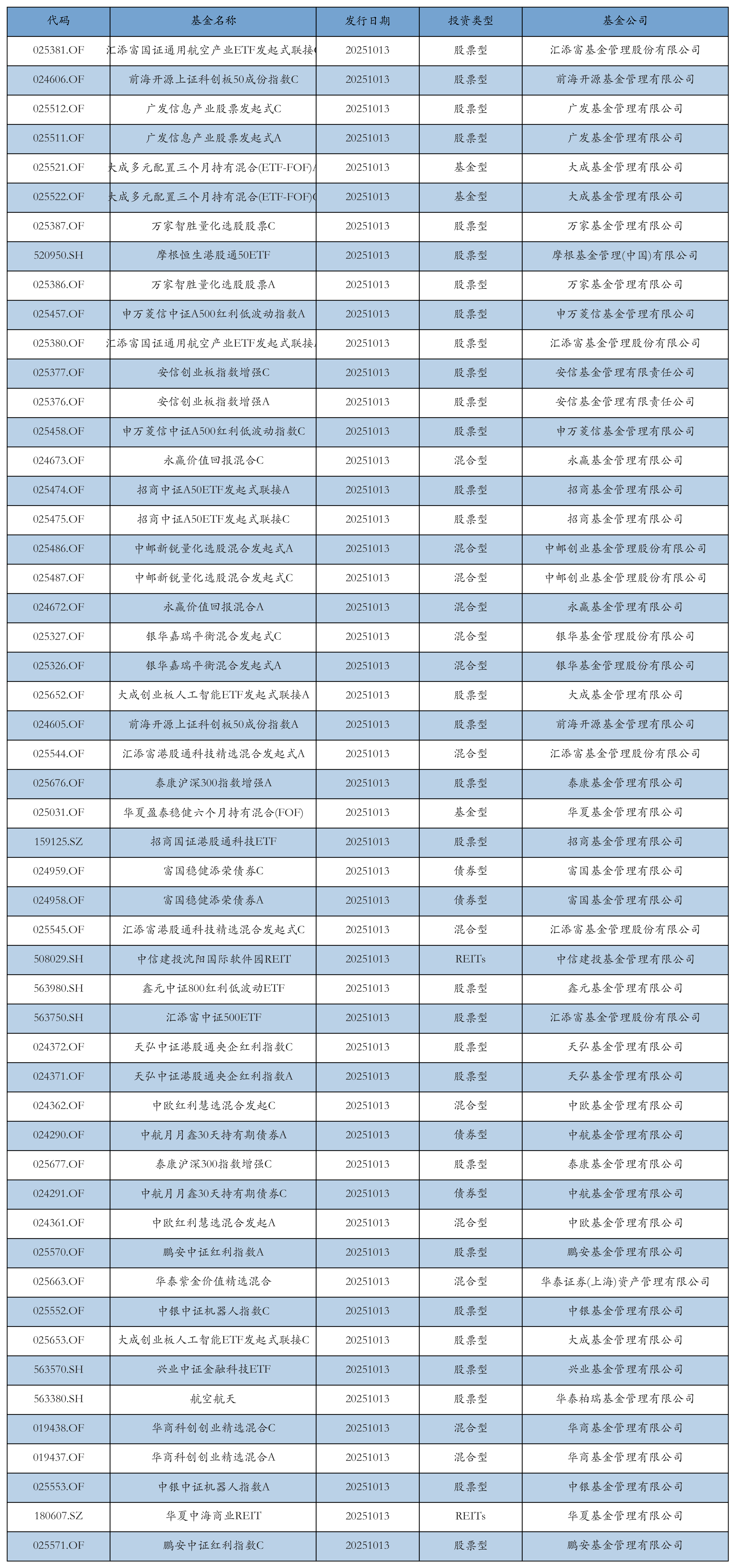 昨日有52只新基金发行,分别为:汇添富国证通用航空产业ETF发起式联接C、前海开源上证科创板50成份指数C、广发信息产业股票发起式C、广发信息产业股票发起式A、大成多元配置三个月持有混合(ETF-FOF)A、大成多元配置三个月持有混合(ETF-FOF)C、万家智胜量化选股股票C、摩根恒生港股通50ETF、万家智胜量化选股股票A、申万菱信中证A500红利低波动指数A、汇添富国证通用航空产业ETF发起式联接A、安信创业板指数增强C、安信创业板指数增强A、申万菱信中证A500红利低波动指数C、永赢价值回报混合C、招商中证A50ETF发起式联接A、招商中证A50ETF发起式联接C、中邮新锐量化选股混合发起式A、中邮新锐量化选股混合发起式C、永赢价值回报混合A、银华嘉瑞平衡混合发起式C、银华嘉瑞平衡混合发起式A、大成创业板人工智能ETF发起式联接A、前海开源上证科创板50成份指数A、汇添富港股通科技精选混合发起式A、泰康沪深300指数增强A、华夏盈泰稳健六个月持有混合(FOF)、招商国证港股通科技ETF、富国稳健添荣债券C、富国稳健添荣债券A、汇添富港股通科技精选混合发起式C、中信建投沈阳国际软件园REIT、鑫元中证800红利低波动ETF、汇添富中证500ETF、天弘中证港股通央企红利指数C、天弘中证港股通央企红利指数A、中欧红利慧选混合发起C、中航月月鑫30天持有期债券A、泰康沪深300指数增强C、中航月月鑫30天持有期债券C、中欧红利慧选混合发起A、鹏安中证红利指数A、华泰紫金价值精选混合、中银中证机器人指数C、大成创业板人工智能ETF发起式联接C、兴业中证金融科技ETF、航空航天、华商科创创业精选混合C、华商科创创业精选混合A、中银中证机器人指数A、华夏中海商业REIT、鹏安中证红利指数C,详情见下表: