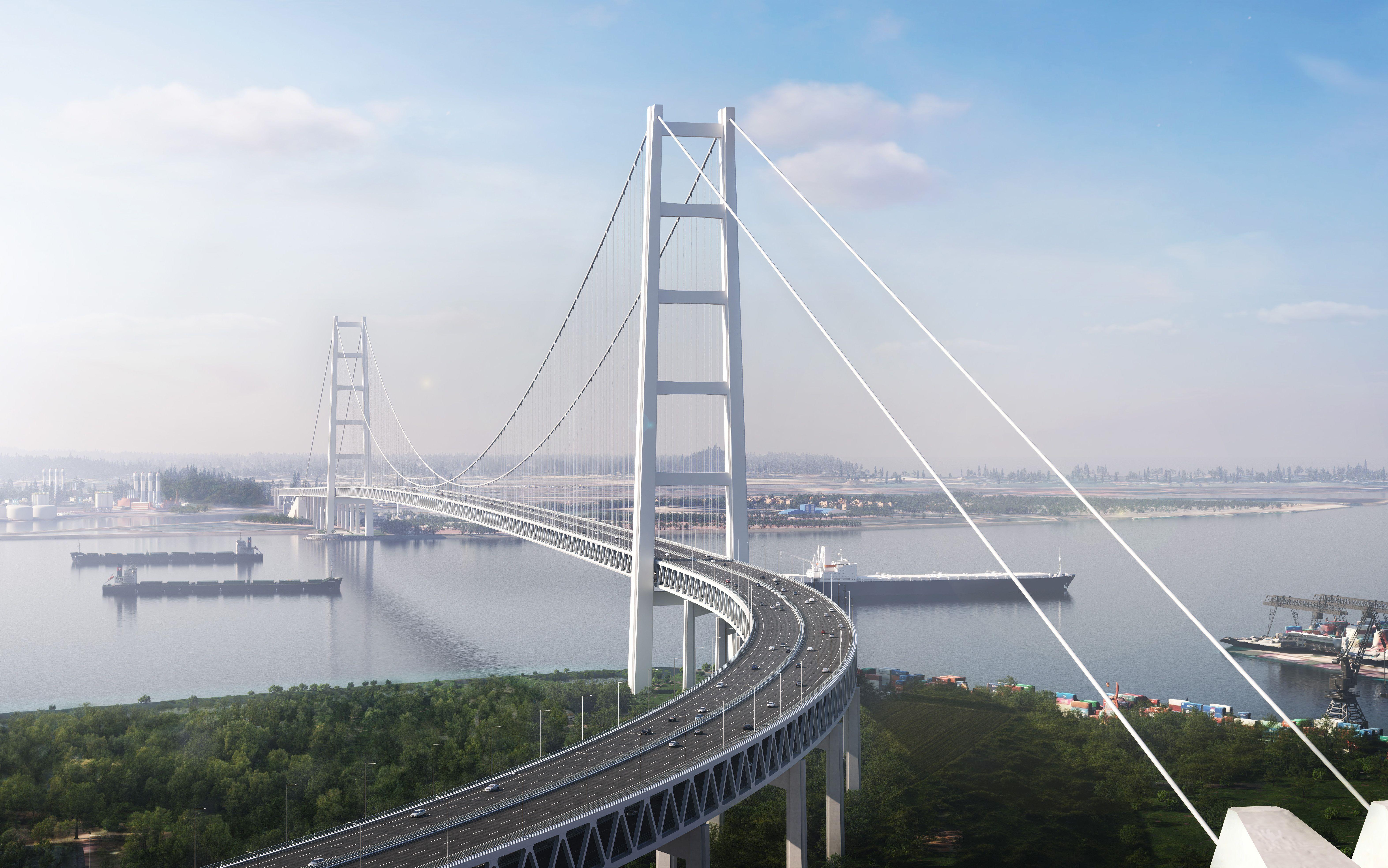 “我们对多个主桥桥位方案进行了比选,最终确定了当前这个主跨2180米一跨过江的双层钢桁悬索桥方案。这无疑是挑战极限,但也是实现项目战略价值、满足未来发展需求的最优解。”为最大化提升通道的服务能力,全国工程勘察设计大师、中交公路规划设计院有限公司总工程师崔冰带领副总工程师徐军等资深技术人员组成的公规院设计团队,通过大量数据分析、方案比选与科学论证,最终确定了跨江主桥为上下双层“8+8”车道的方案,上下层均为高速公路,设计时速100公里。这一设计方案不仅极大提高了通行能力,也为未来交通增长预留了充分空间。