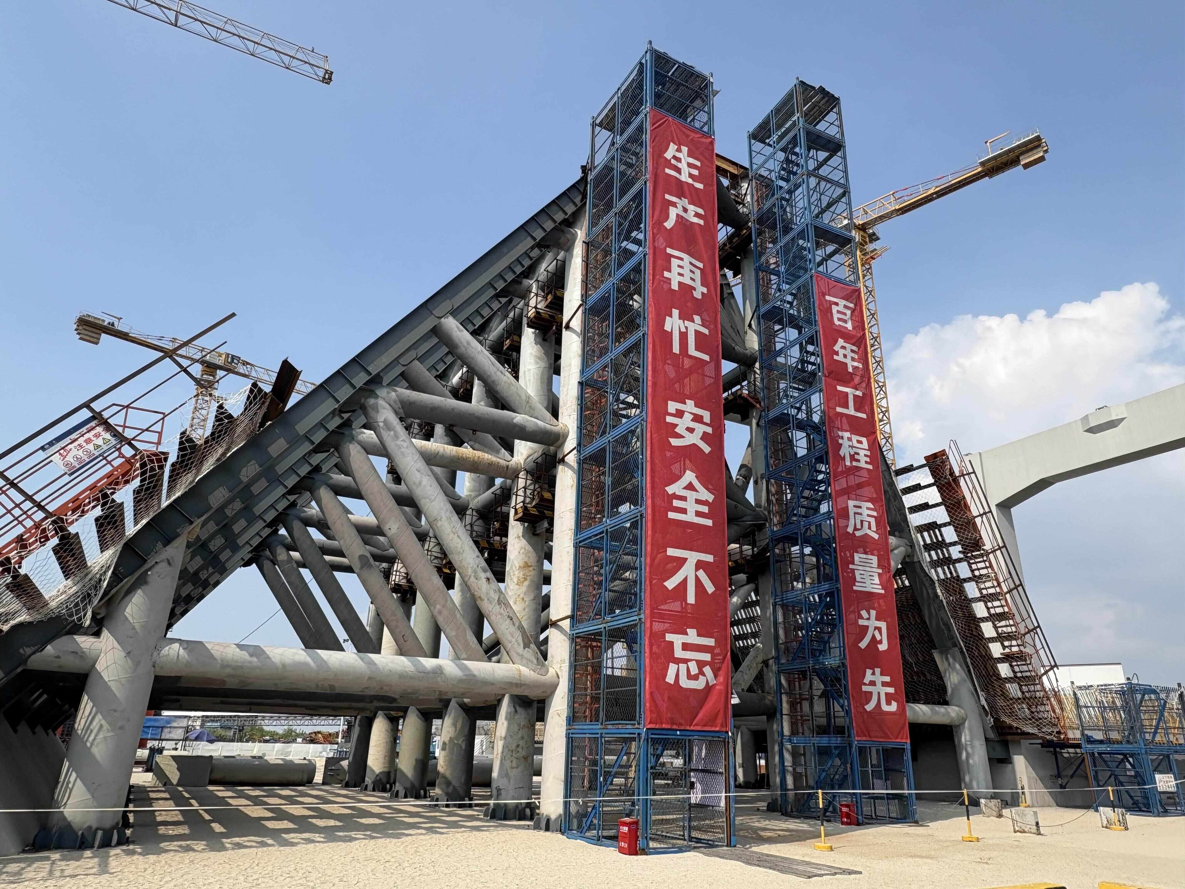2025年秋日,珠江口上,天蓝云白,建成后约相当于114层楼高的狮子洋大桥正拔地而起。