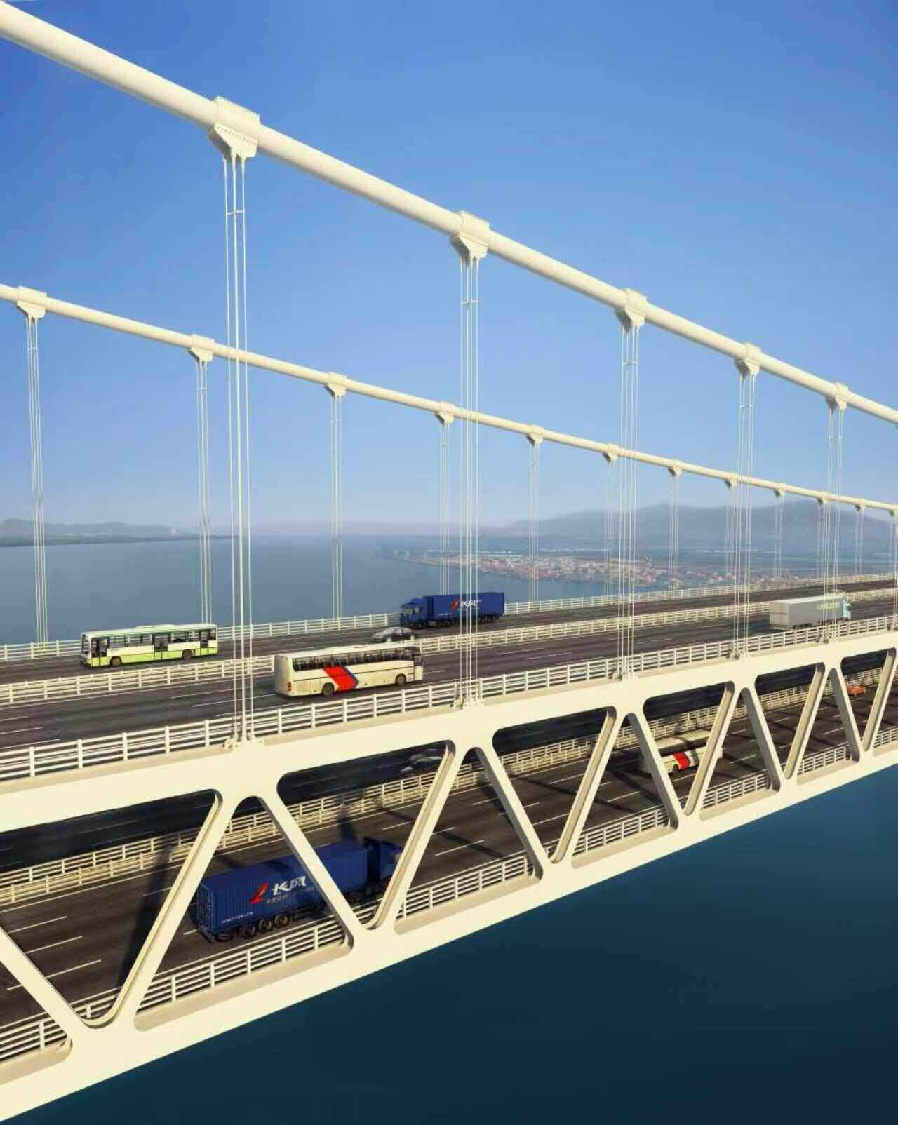 狮子洋大桥作为项目的关键控制性工程,以其主跨2180米的超大跨径,一跨过江,建成后将创下双层悬索桥“主跨跨径(2180米)、主塔塔高(342米)、锚碇基础(直径130米)、主缆规模(直径1.5米)、车道数量(上下双层16车道)”五项世界第一。