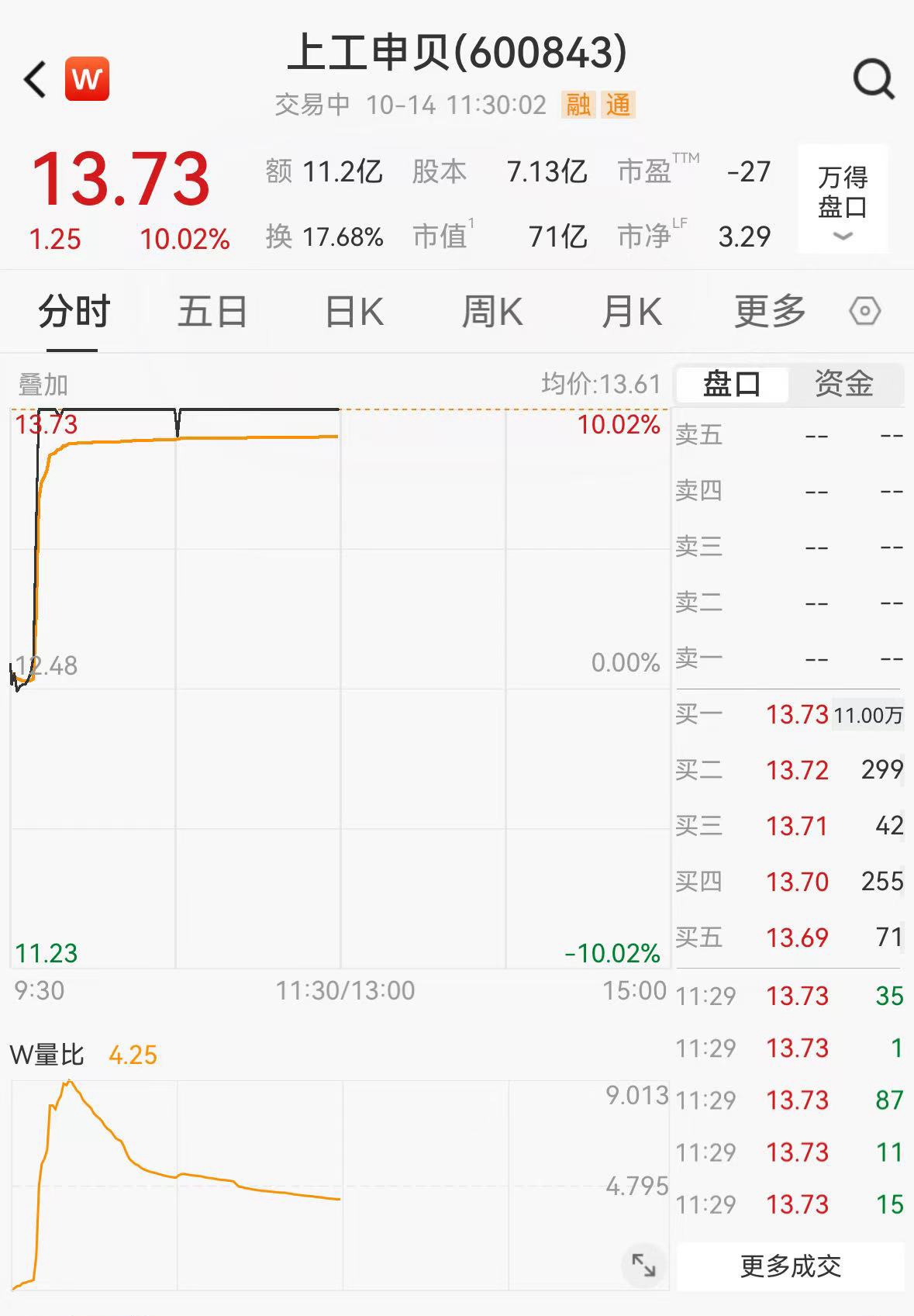 10月14日,上工申贝(600843.SH)股价迅速涨停,报13.73元/股。